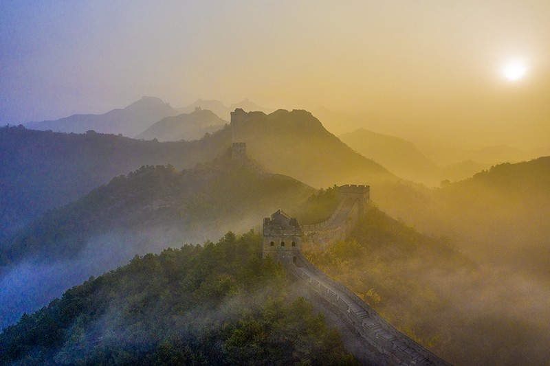 這是2023年11月1日拍攝的河北承德金山嶺長(zhǎng)城日出景觀(無(wú)人機(jī)照片)。新華社發(fā)(周萬(wàn)平 攝)
