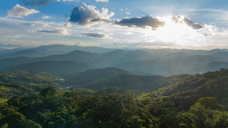 這是2023年9月16日拍攝的日落時(shí)分的云南普洱景邁山風(fēng)光(無(wú)人機(jī)照片)。新華社記者 胡超 攝