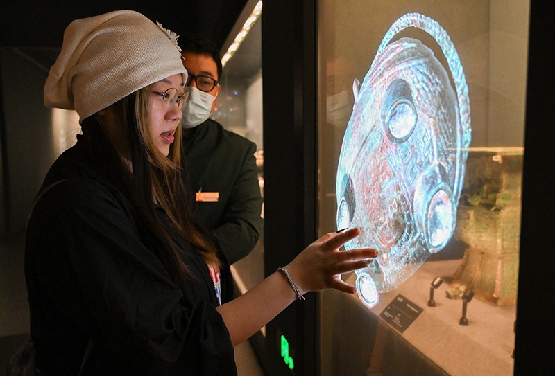 2023年9月15日,觀眾在位于北京奧林匹克公園核心區(qū)的中國(guó)考古博物館內(nèi)體驗(yàn)互動(dòng)屏幕。新華社記者 李賀 攝